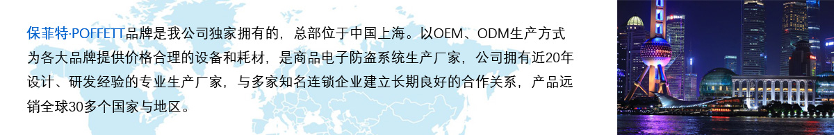 保菲特·Poffett成立于2004年2月:专业从事于RFID自动识别技术和射频探测技术产品研发、制造和销售的高科技民营企业。商品电子防盗系统(Electronic alarm system;简称EAS)及其耗材的专业制造商。以OEM、ODM生产方式为各大品牌提供价格合理的设备和耗材,现有产品均采用全新技术精心研制而成,产品设计精良,用料考究,工艺精细,性能优异,具有检测灵敏度高抗干扰能力强,性能稳定等特点。